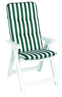 Marken-Auflagen aus dem Hause Best: Mit der grün/weißen Hochlehnerauflage werden Ihre Gartenstühle und Sessel gleich doppelt bequem. Die hochwertige Auflage besteht aus einem 6 cm starken Schaumstoffkern mit thermisch verfestigter Vliesumhüllung, ummantelt von einem Bezug aus strapazierfähiger, 100 % Baumwolle.