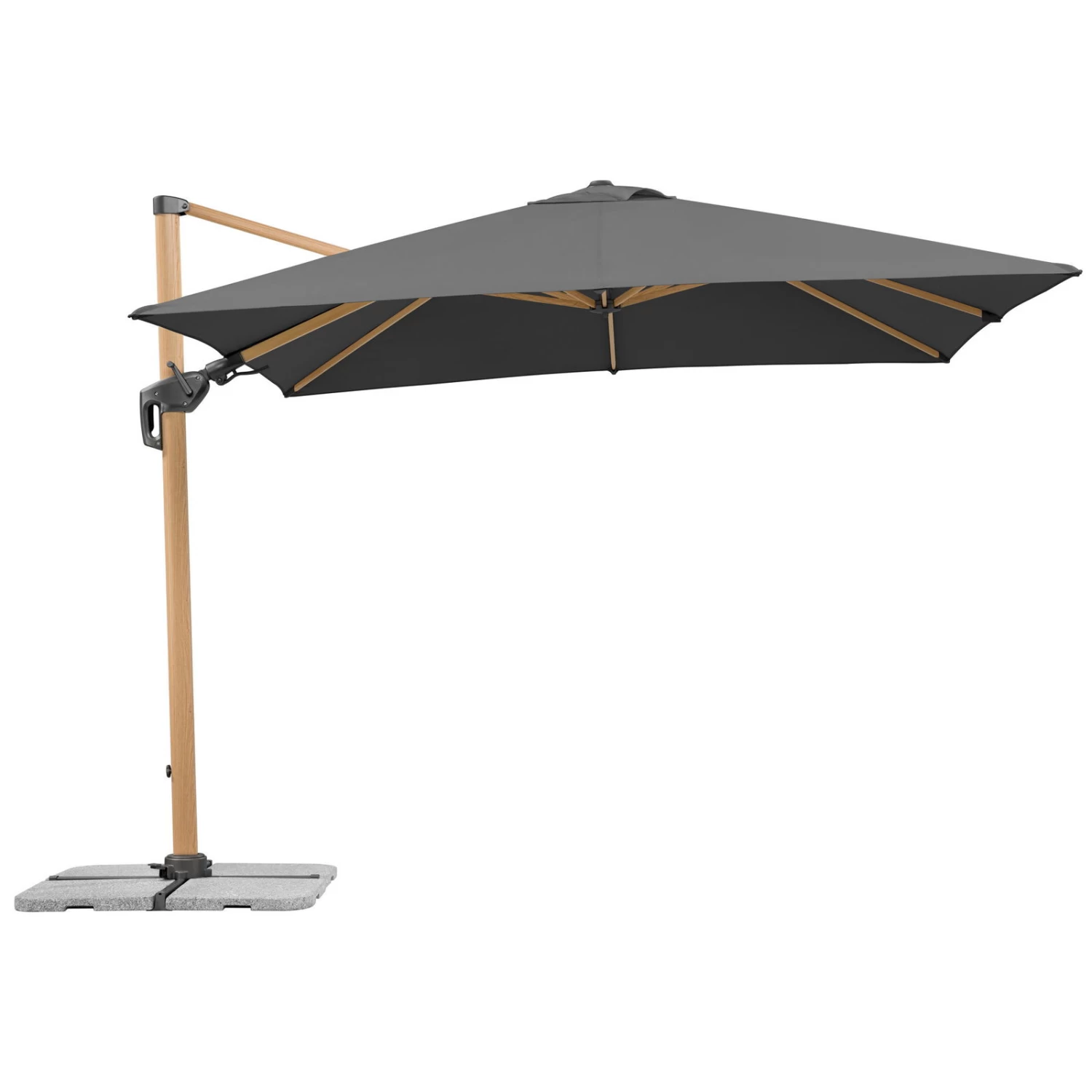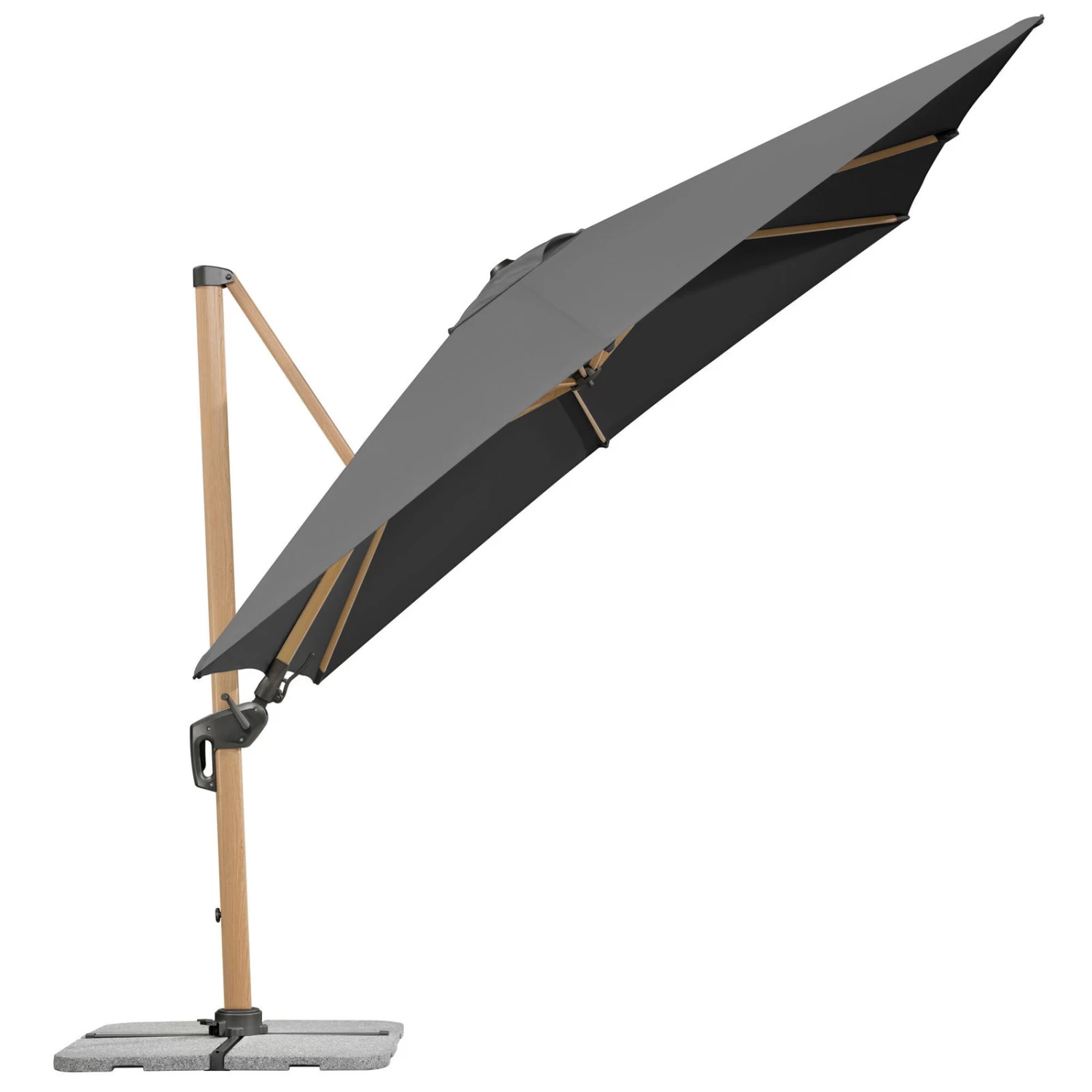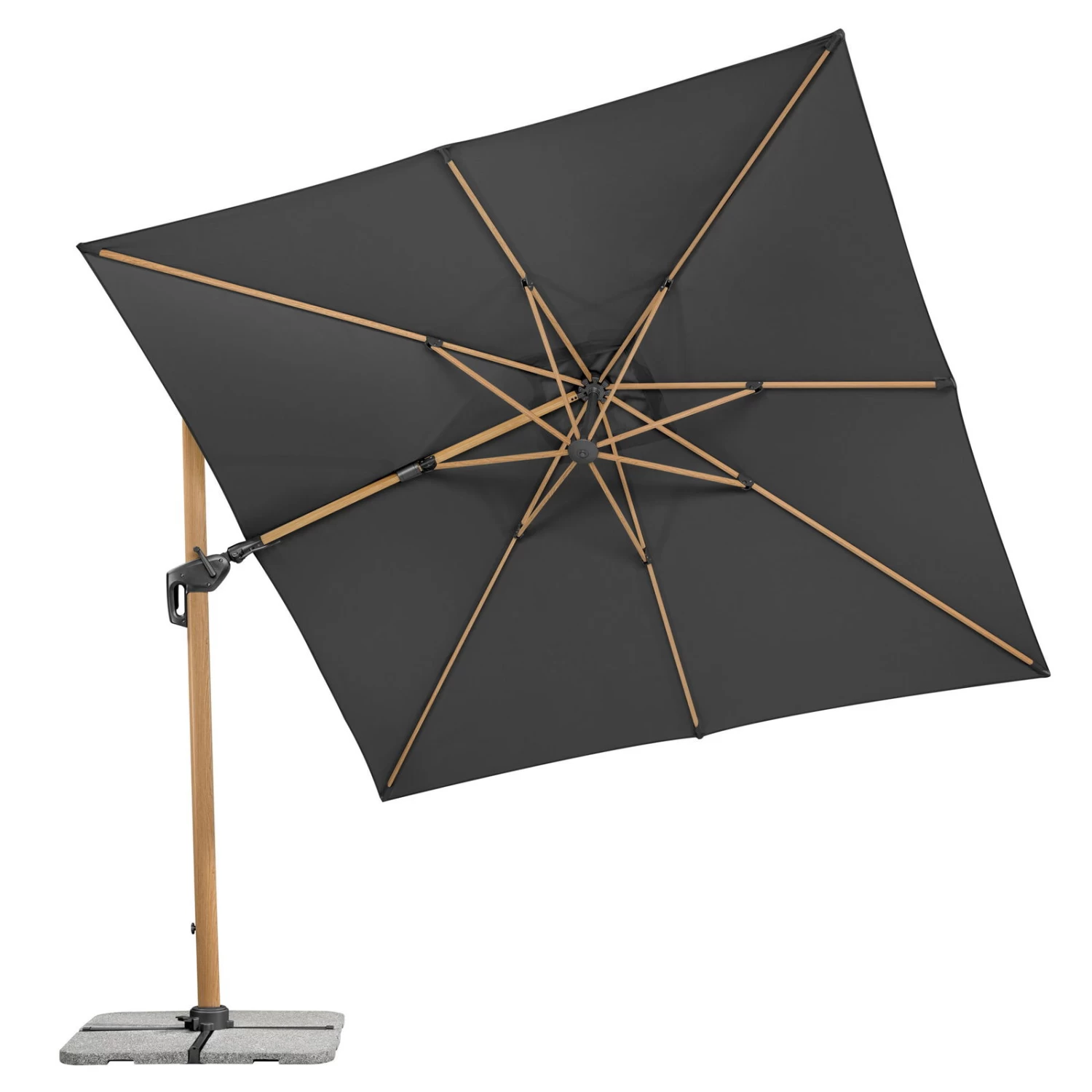 Mit dem multifunktionalen Pendelschirm ‚Rhodos Twist Woody‘ gönnen Sie sich Luxus in Ihrem Outdoorbereich. Der anthrazitfarbene Schirm in der GröĂe 300 x 300 cm ist mithilfe eines FuĂpedals um 360 Grad drehbar und am Mast bis zu 50 Grad neigbar. Am Auslegearm können Sie ihn bis zu 45 Grad kippen. Das gibt Ihnen maximale FlexibilitĂ€t. Der Pendelschirm besteht aus Alu/Stahl und Polyester und hat den UV-Schutz 50+.