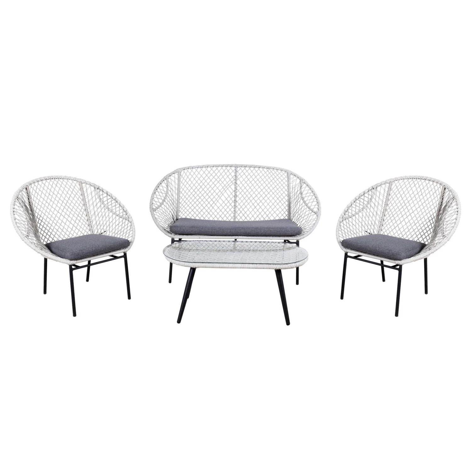 Diese 4-teilige Sitzmöbelgruppe besticht durch eine elegante, schwerelose Optik und bietet Ihnen zugleich einen hohen Sitzkomfort. Die Sitzgruppe Nairobi mit Kunststoffgeflecht wertet Ihr Einrichtungskonzept im Innen- oder Außenbereich durch eine trendige Note auf. Die Sitzgruppe ist witterungsbeständig, pflegeleicht und zugleich stabil gebaut.