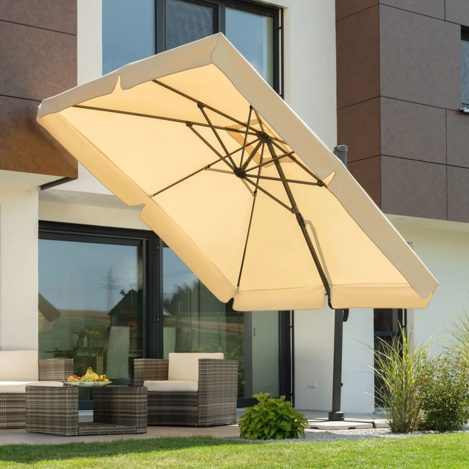 Der Ampelschirm Rhodos von Schneider ist Ihr groĂzĂŒgiger Schattenspender fĂŒr Terrasse, Loggia oder Garten. Dank eines leichtgĂ€ngigen FuĂpedals lĂ€sst sich der Pendelschirm um 360 Grad drehen, auĂerdem können Sie mit wenigen Handgriffen den Sonnenschirm neigen und kippen. Ein schattiges PlĂ€tzchen ist Ihnen daher den ganzen Tag ĂŒber sicher.